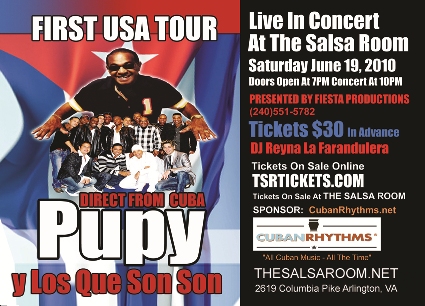 Things are happening quickly now. Pupy y Los Que Son Son are already set up for 10 concerts that I know of and more and more keep being added. The most recent addition to the tour list is June 19, 2010 - Arlington, VA. - The Salsa Room Don't miss out on this historic first tour! Find a concert near you or you'll be kicking yourself later. If you know of a concert not on our list send me an e-mail .