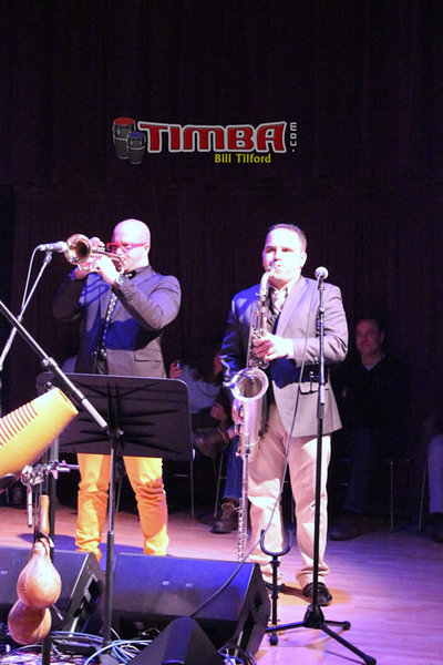 I don't think that Tiempo Libre has ever had a problem with those of us in the music community who appreciate bands that can do almost anything, but a few years ago, some of the most hard core Timba dancers seemed to react to the critically-acclaimed Bach in Havana almost as if it were some sort of betrayal, and they didn't return to the fold in quite the same numbers that they should have when the more recent excellent dance album My Secret Radio was released. Bands with less fortitude might have been tempted to abandon dance music altogether in favor of more lucrative Jazz or classical collaborations, but TL stuck to its guns, and I had the pleasure of finally witnessing this group get the love that it deserves from dance audiences the other night. It helped that the Old Town School of Folk Music staged the event in their dance hall rather than the concert hall - the open floor was put to good use by both the band and the audience, which mingled freely during the performance - leader Jorge Gómez promised the crowds a Cuban party, and he and the band delivered. Since I have been critical of the acoustics at some Chicago concerts during the past year, I should take a moment to mention that they were fine here, at least during the first show (reluctantly, I was pulled away during the second one by other urgent matters). This was also a well-attended event, and as you'll see from some of the photos, the crowd was either on its feet or waving its arms in its chairs. For this audience, the band threw the right mixture of TImba, Funk, R & B, traditional Cuban, and yes, a little Classical Fusion too.