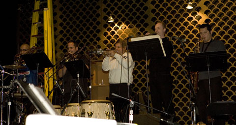 Nestor Zabala trombone/music director, Ismael Vergara sax, Dante Vargas trumpet and Peter Francis trumpet