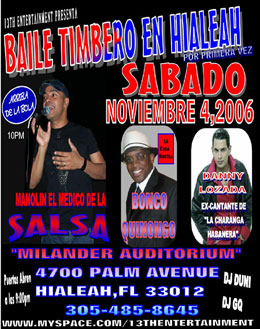 Wednesday, Nov. 1, 2006 - Manolín & Dany Lozada Together Saturday Night! - If that's not enough to get you crazy Miamians out of the house this weekend, here's the deal-closer: timba.com's own Duniel Deya will be the DJ. Stay home at your peril. Click here for a larger version of the poster.